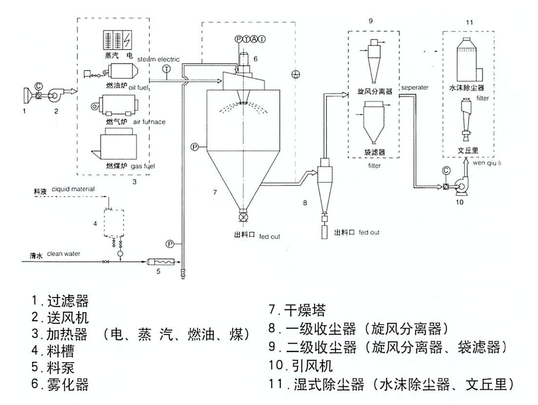 空氣通過(guò)過(guò)濾器和加熱器,進(jìn)入干燥塔頂部的空氣分配器,然后呈螺旋狀均勻進(jìn)入干燥室。料液由料液和熱空氣并流接觸,水份迅速蒸發(fā),在極短的時(shí)間內(nèi)干燥為成品。成品由干燥塔底部和旋風(fēng)分離器排出,廢氣由風(fēng)機(jī)排出。