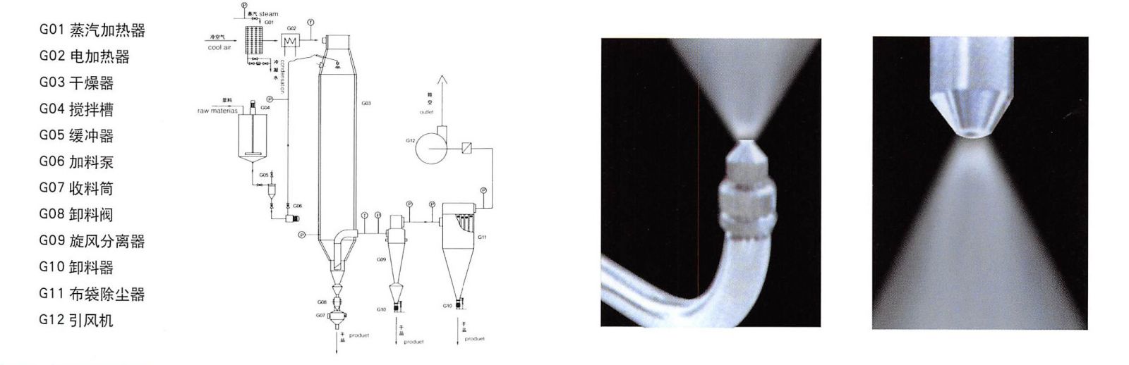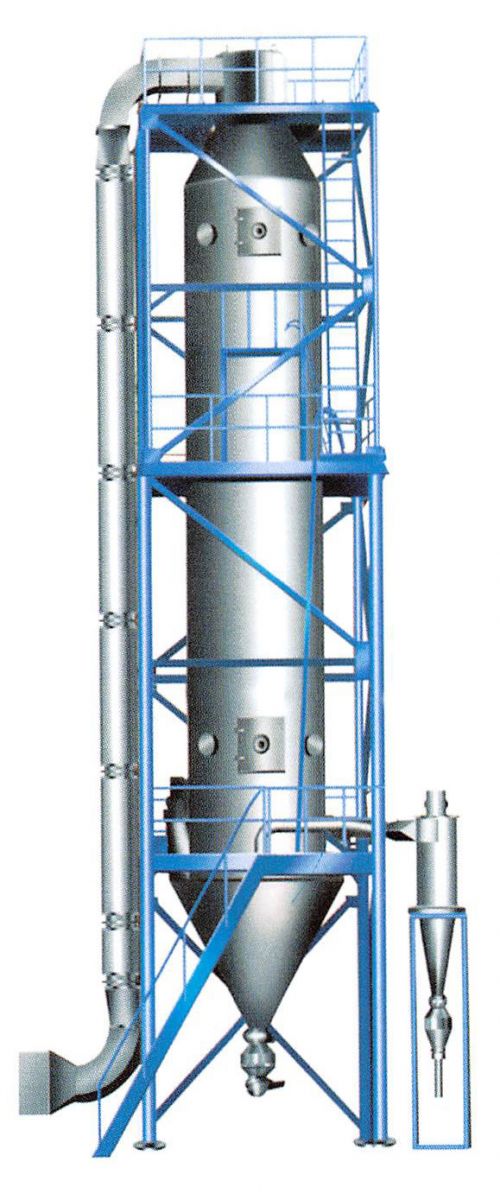 本機(jī)組工作過程中為:料液通過供料泵均勻輸入,噴出由壓縮空氣霧化成霧狀液滴,然后同熱空氣并流下降,大部分粉粒由塔底排料口收集,廢氣及其微小粉末經(jīng)旋風(fēng)分離器分離,廢氣由排風(fēng)機(jī)排出,粉末由設(shè)在旋風(fēng)分離器下端的收粉筒收集,風(fēng)機(jī)出口處還可裝備二級(jí)裝置,回收率在96-98%以上。